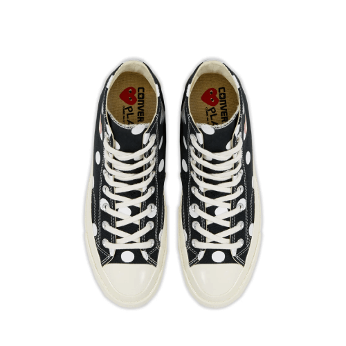 Step into iconic streetwear fashion with the CDG Play Converse Polka Dot Red Heart Chuck Taylor All Star ’70 High Sneakers, a collaboration that perfectly blends playful design with timeless sneaker heritage. This standout pair is instantly recognizable thanks to its bold black-and-white polka dot pattern, contrasted by the signature red heart logo designed by Comme des Garçons Play. Built on the classic Chuck Taylor All Star ’70 silhouette, these sneakers deliver both comfort and style, making them an essential piece for sneaker lovers and fashion enthusiasts alike.
